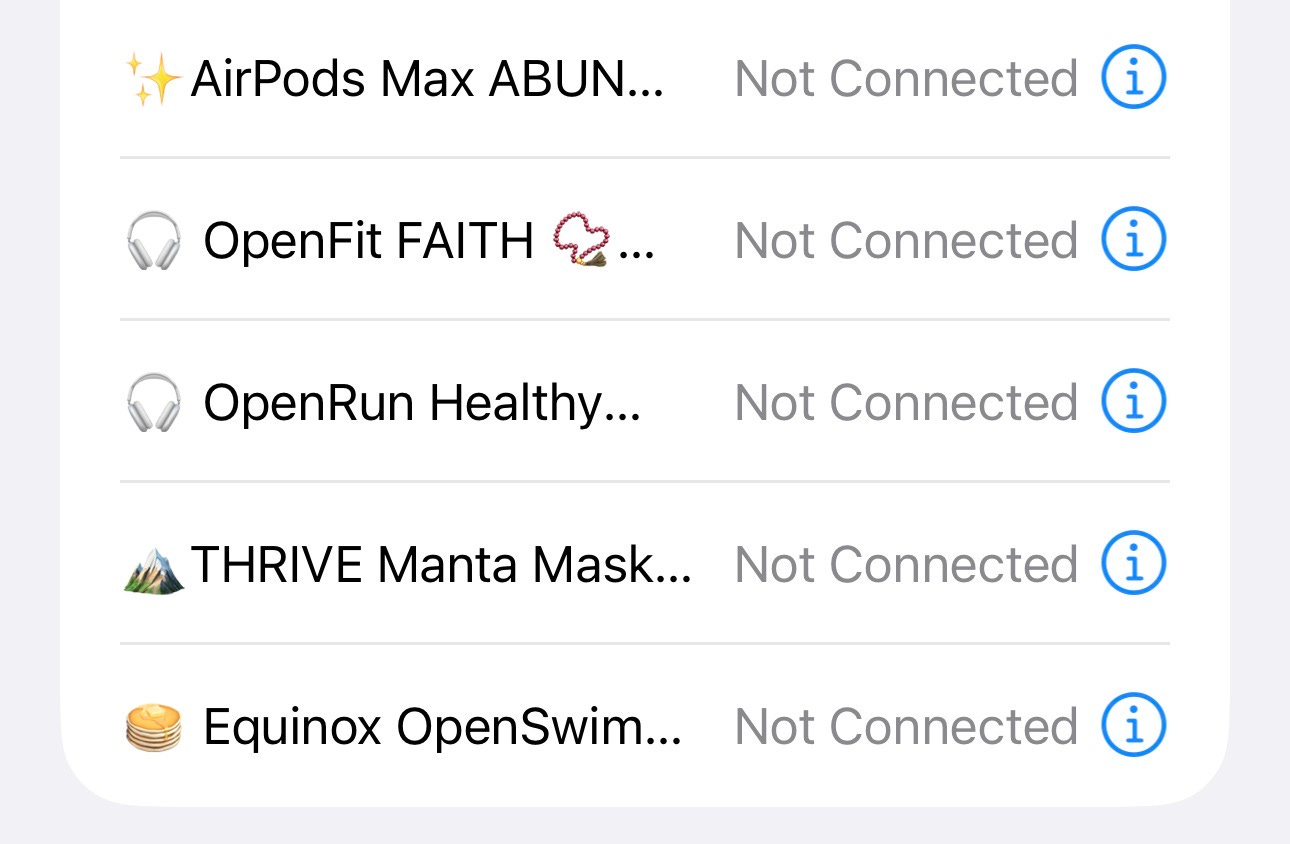I love buying something small I can wear with the word on it—one year it was a beaded bracelet on Etsy that said FAITH in small black letters. For ten years, I have also renamed whatever new Bluetooth devices I set-up that year with my chosen word or theme (and an emoji, of course). So now, for example, I listen to my “FAITH AirPods,” my “ABUNDANCE Bose,” type on my “MIRACLES MacBook Air,” or I put on my “BREAKTHROUGH Manta Sleep Mask.” It’s a way to remind me of earlier years’ themes, layered over time in one big beautiful Bluetooth list. Here’s an incomplete list of examples: